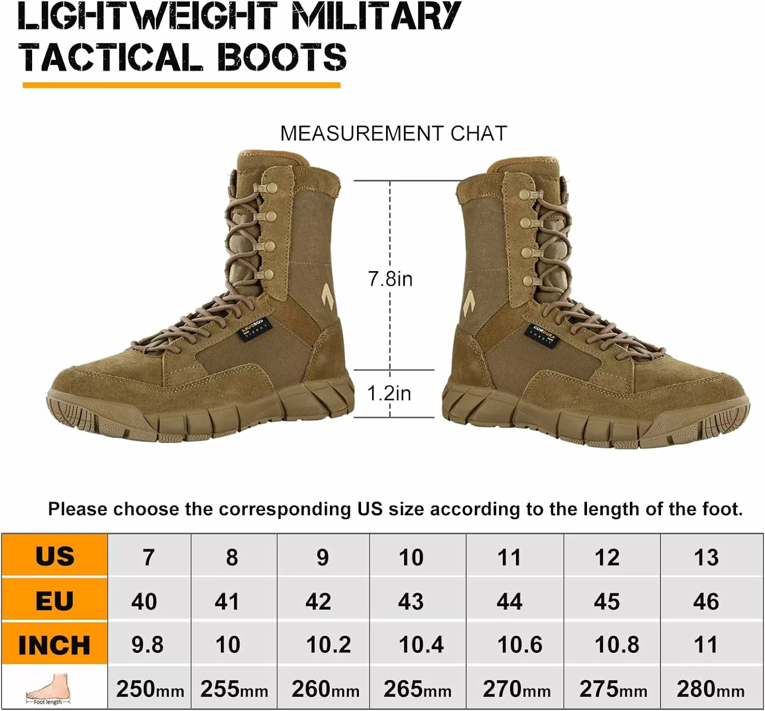 - LÉGER & CONFORTABLE: Le poids total de ces plus grandes chaussures de combat en plein air est d’environ 1200g(2.6 lb).Une semelle intercalaire en EVA offre un confort léger et un soutien bercé , un coussin de semelle intérieure haute densité permet à nos bottes tactiques de réduire la fatigue des pieds pendant les longs travaux.
