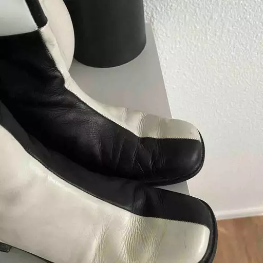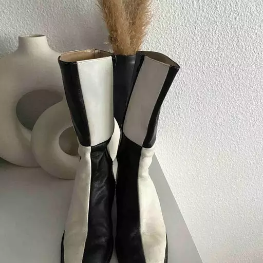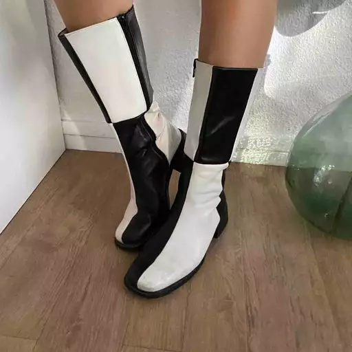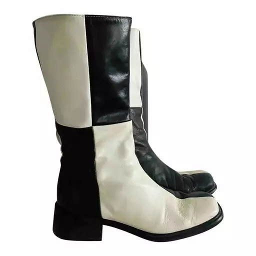 Bottes en cuir bicolore des années 70, blanches et noires. Elles sont mi hautes avec fermetures éclair. Très confortables .