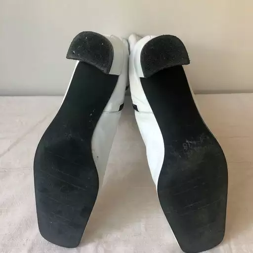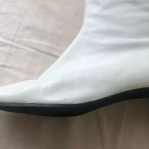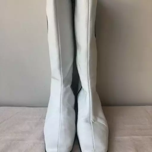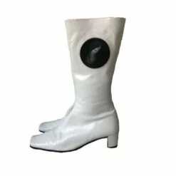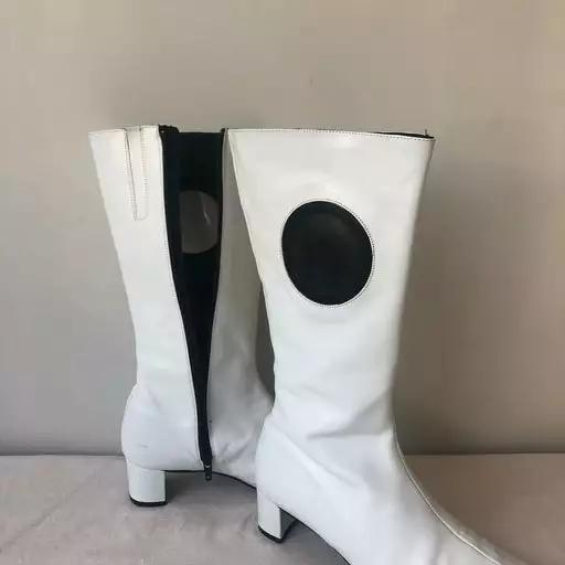 Bottes années 70 entièrement cuir. Le haut de la botte est percée d’un disque en plastique typique des années 70. Ce sont des bottes qui arrive mi mollet.