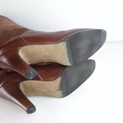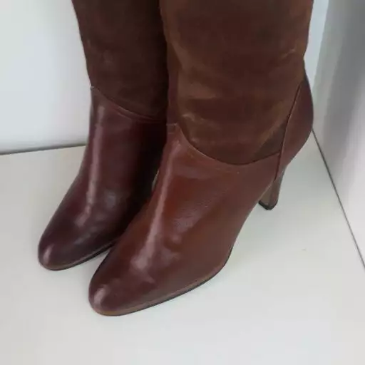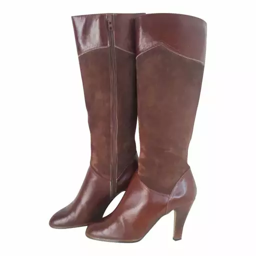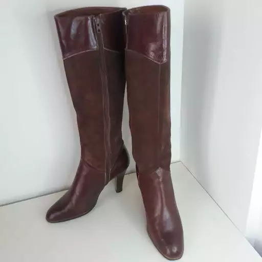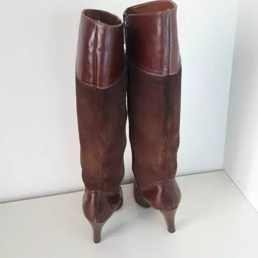 Superbes bottes à talons vintage années 70, bi-matière cuir et daim couleur fauve avec fermeture éclair. Hauteur tige 35 cm, tour de mollet 34 cm.