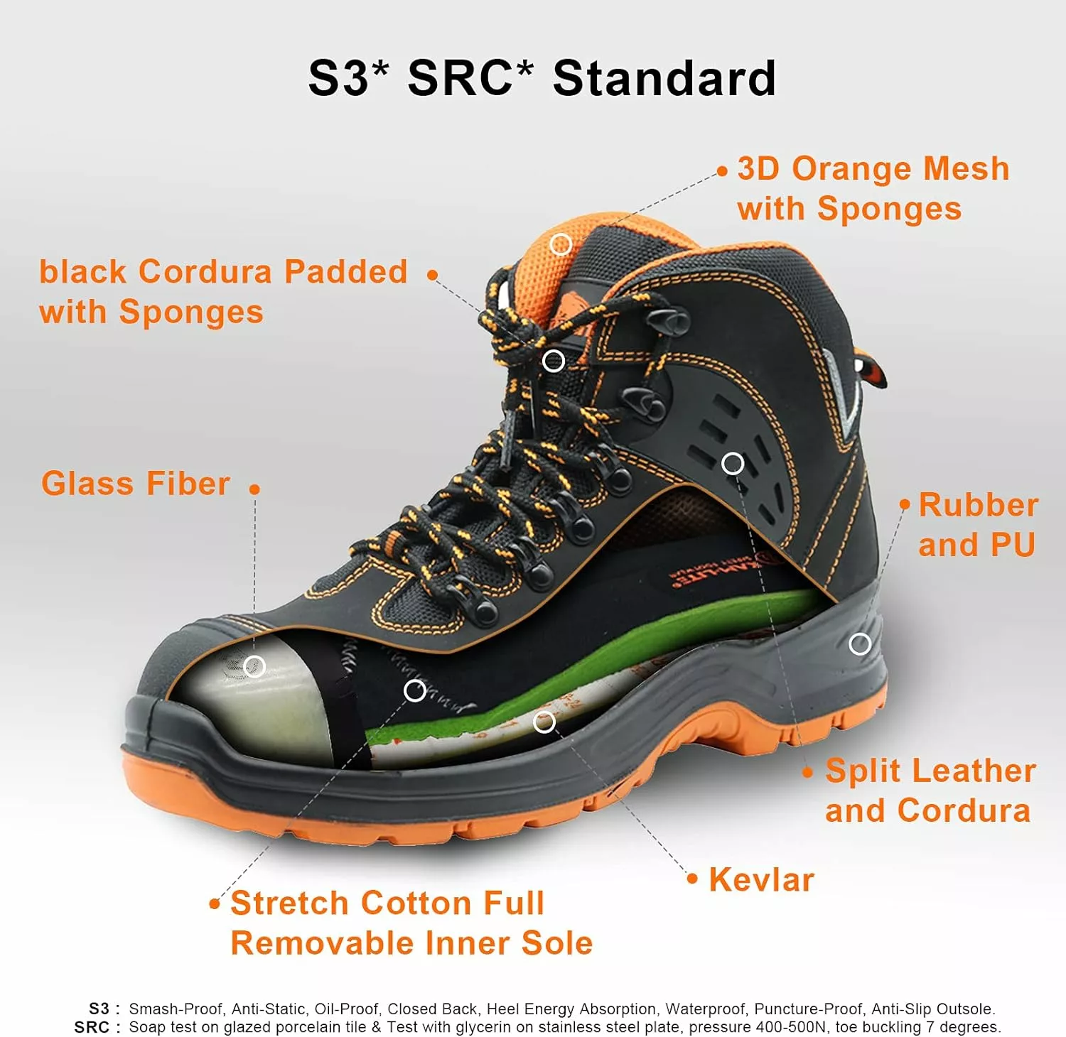 - 【LIGHTWEIGHT SAFETY WORK BOOTS】: Ces chaussures de travail KAM-LITE pour hommes et femmes sont construites avec des semelles intermédiaires composites en fibre de verre Toe et KEVLAR. Cette combinaison peut réduire le poids de l’ensemble de la paire de chaussures de sécurité d’environ 30%. La pointe composite non métallique résiste à la corrosion et dépasse la norme américaine ASTM F2413-18 et les normes de danger électrique. Plaque de semelle intermédiaire anti-crevaison éviter d’être poignardé par des objets tranchants comme des clous, verre brisé, plombages en fer.
