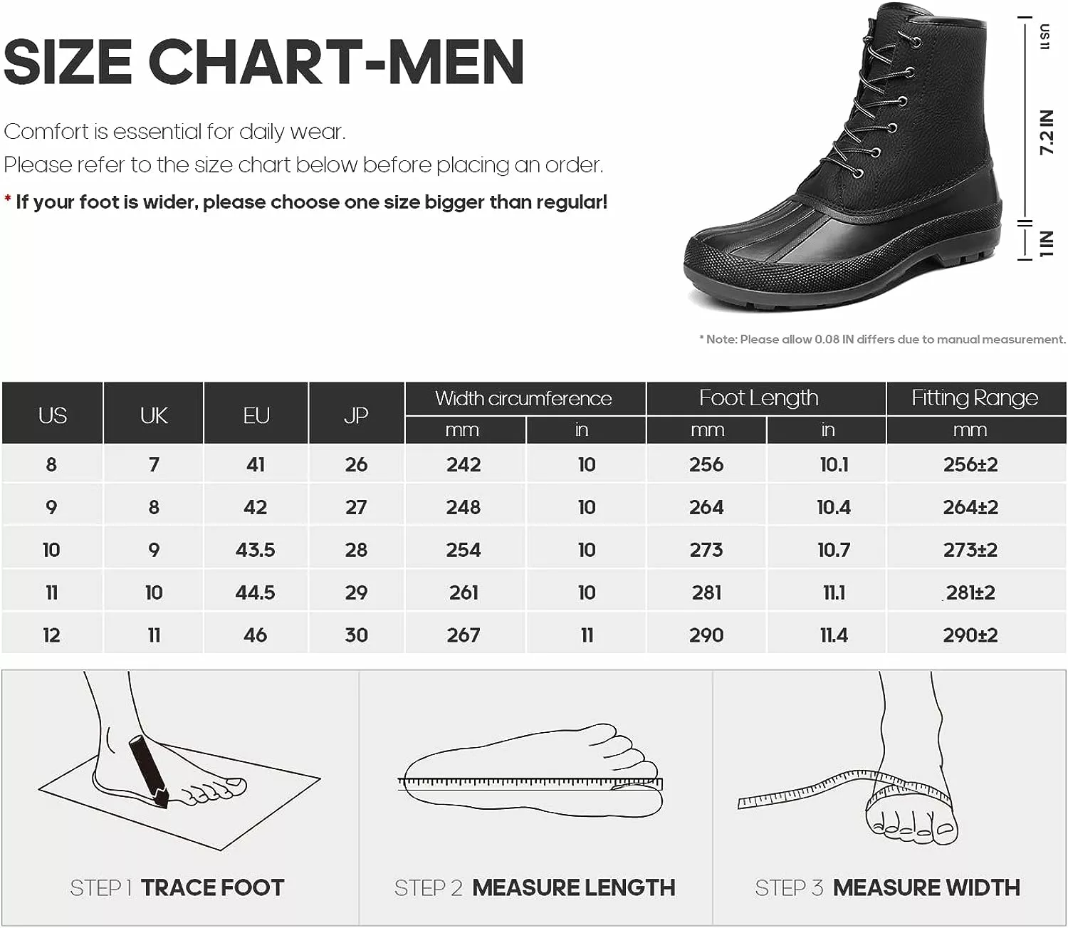 - Construction étanche: Créé avec une coque imperméable et une tige résistante à l’eau. Ces bottes de neige men’s gardent vos pieds au sec dans les jours pluvieux ou enneigés.Si votre pied est plus large, veuillez choisir une taille plus grande que la normale.