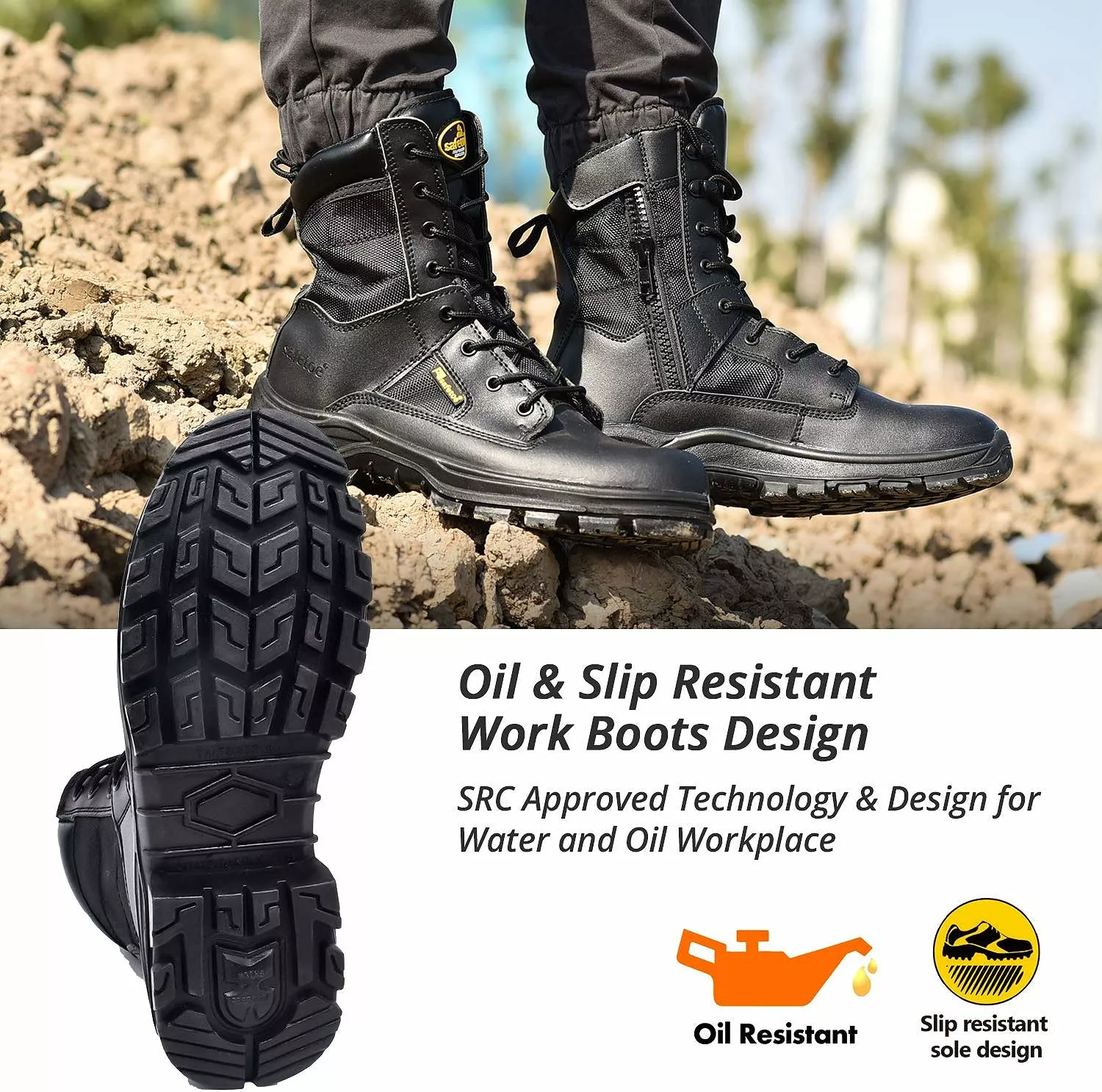 - 🇺🇸【LIGHTWEIGHT & FIT 】– Cette fermeture à glissière latérale YKK bottes tactiques faites avec la taille US. Si vous hésitez à choisir la taille, s’il vous plaît confirmer la longueur de vos pieds avec notre tableau des tailles. Ces bottes de travail militaires pour hommes pèsent environ 3,5 lb/56,4 onces. La langue fermée à soufflet empêche les cailloux, le sable et autres débris d’entrer dans ces bottes. Oeillets et dentelle en métal durables, rapides sur et hors tension. YKK fermeture à glissière latérale robuste avec fermeture pour ces bottes de moto faciles à mettre les pieds dans des bottes de travail noires de 8 pouces