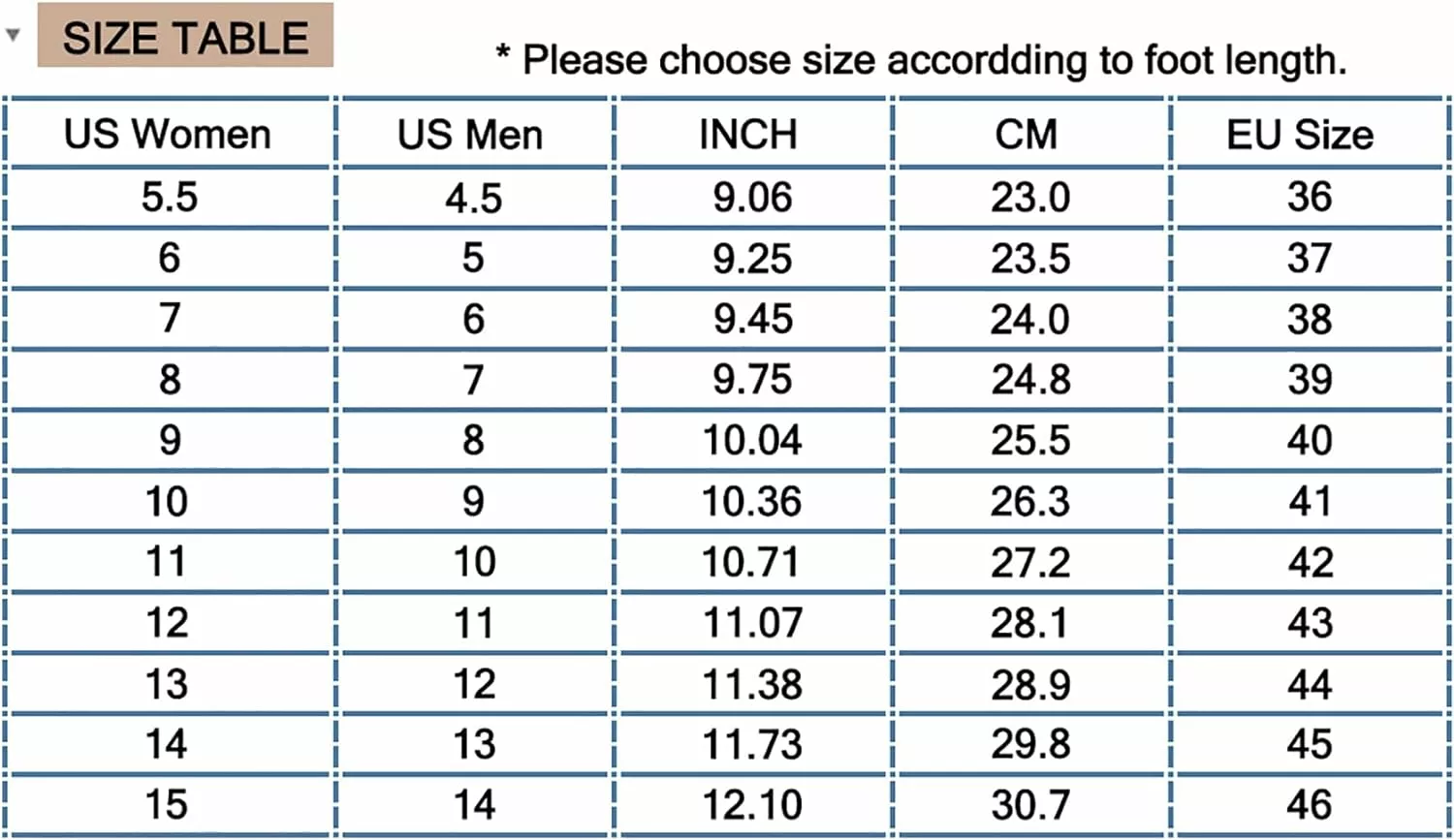 - Pls. Attention: Assurez-vous que l’achat est basé sur notre tableau des tailles » Description du produit. Mesurez la longueur de votre pied et sélectionnez la taille de pied correspondante.
